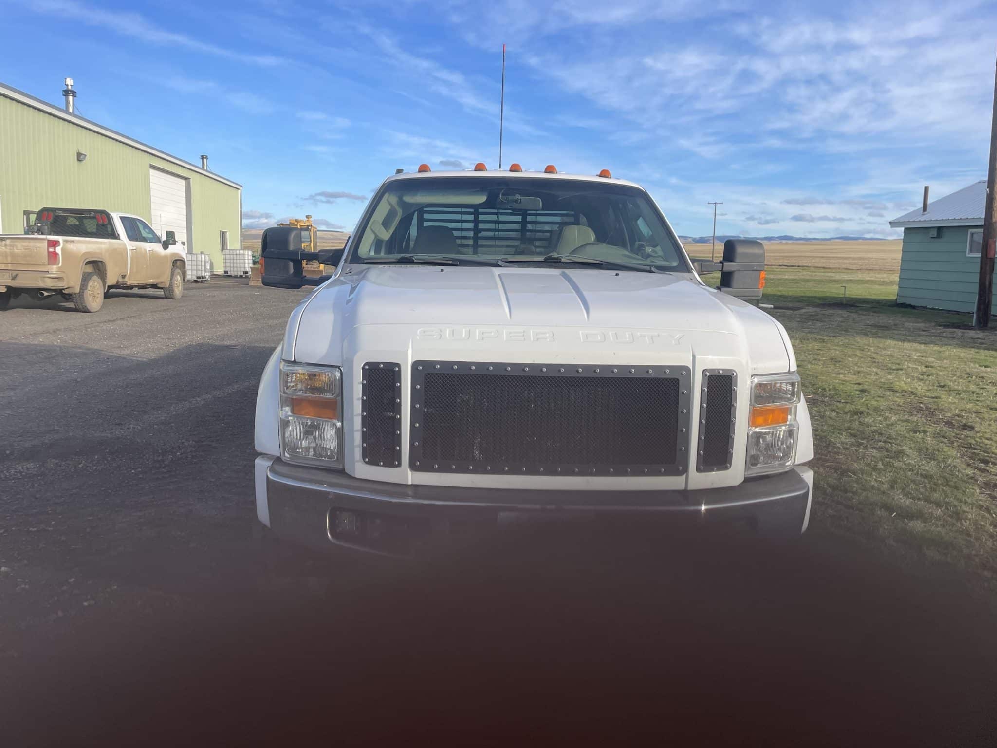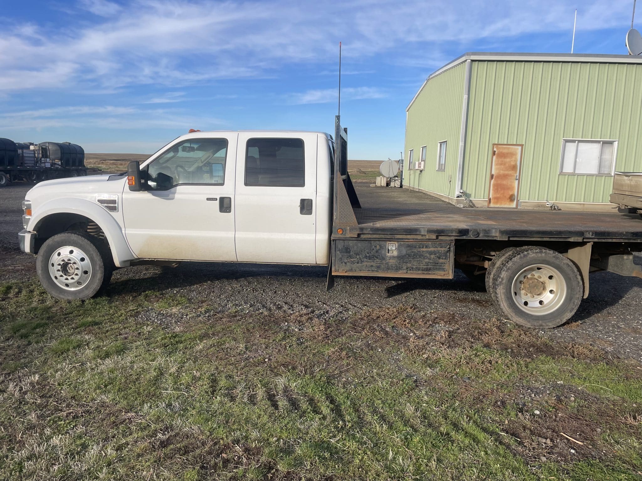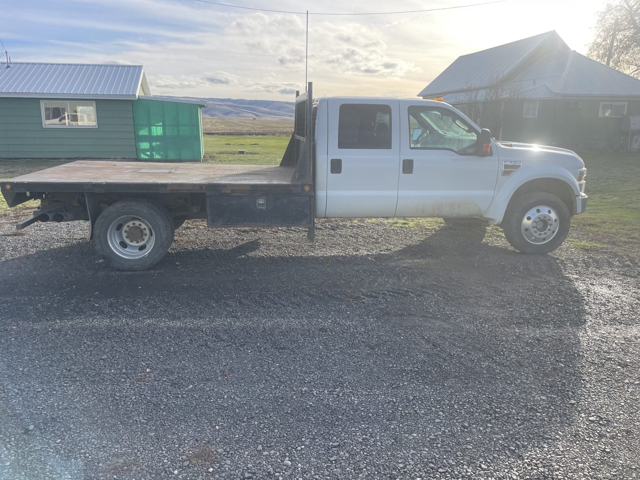 2008 Ford F550, Crew Cab, leather, 6.4L Diesel, 4×4, duals, 89,000 miles, flatbed with boxes and trailer ball hitch, good tires and aluminum wheels.